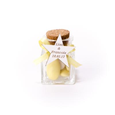 Composition garnie de dragées tendance et originale, avec déco étoile  en bois pour évènement mariage, anniversaire ou baptême fille ou garçon. Pour thème vraiment à la mode celui des étoilés, pour le plus grand bonheur de vos invités. Les bonbonnières peuvent se poser sur un support ou alors sur les tables dans les assiettes ou prés du verre. Jamais à court d' idée la boutique propose encore et toujours de l' originalité avec la personnalisation du sujet, vous pouvez y inscrire le ou les prénoms et la date de l' évènement.