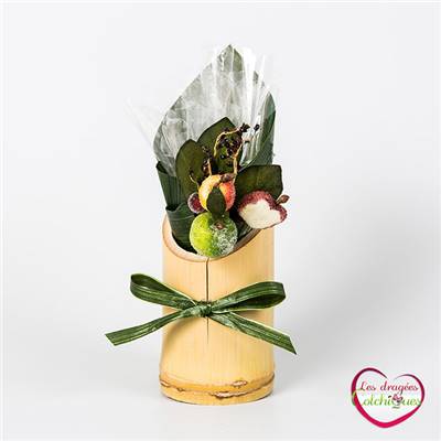 Les contenants à dragées sur le thème champêtre présentent généralement des couleurs terreuses comme le marron, le vert ou le beige et comprennent souvent des éléments naturels comme les feuilles et des bouquets de fleurs. Un thème vraiment tendance depuis plusieurs années car vous pouvez utiliser des matières nobles comme les bois, la paille, fleurs séchées et raffia.